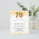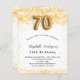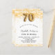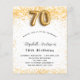 Para uma festa de aniversário elegante. Um fundo branco chic. Decorado com brilho de ouro falso, brilhos. Personalize e adicione um nome, idade e detalhes da festa. O nome é escrito com um script de estilo manuscrito. Número 70 com letra de estilo de balão.