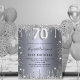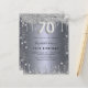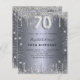 Um convite moderno, na moda e glamouroso para uma festa de aniversário 70. Um fundo com aparência de prata falsa, decorado com poeira brilhante. Personalize e adicione seu nome e detalhes da festa. O número 70 é escrito com uma fonte de estilo de balão, script.