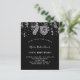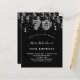 Um convite moderno, na moda e glamouroso para uma festa de aniversário 70. Um fundo preto, decorado com um confete prateado. O nome é escrito com um moderno estilo escrito à mão. Personalize e adicione os detalhes da sua festa. O número 70 é escrito com uma fonte do estilo do balão, padrão leopardo.