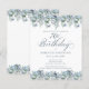 Flores azuis poeirentas criam bordas de cima e de baixo neste elegante convite de aniversário. A caligrafia clássica adiciona um belo toque. Este item é parte da coleção floral de Azul Dusty.