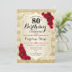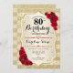 Convite de aniversário de 80. Design elegante em ouro e vermelho. Apresenta faixas de ouro com brilho sutil, fonte de script do rosa vermelha na moda e confetti. Perfeito para uma festa de aniversário de vidro.