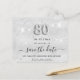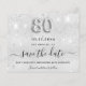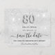 Um elegante cartão Save the Date para uma festa de aniversário 80. Um fundo metálico moderno, falso e prateado, decorado com poeira falsa. Personalize e adicione uma data e nome/idade. O texto: Salvar a Data é gravado com um script de estilo com letra de tendência grande. Número 80 com uma fonte no estilo do balão.