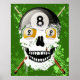 Poster com um design de 8 e 9 bolas com um crânio e pistas de piscina.