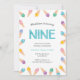 Tenha uma sorvete 9ª festa de aniversário para a sua pequena! Este adorável convite de aniversário apresenta sorvetes coloridos de aquarela do arco-íris que são bonitos e perfeitos para um aniversário de verão. Todos os detalhes, incluindo (exceto idade), são personalizáveis. (Outras idades e cores também disponíveis nesta coleção, ver abaixo) © Mini Moi Impressões