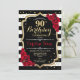90 de festa de convite para mulheres. Cartão de convite branco preto elegante com ouro brilhante falso. Apresenta rosas, fontes de script e faixas de na moda. Perfeito para uma celebração de um dia adulto.