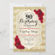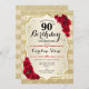 Convite de aniversário de 90. Design elegante em ouro e vermelho. Apresenta faixas de ouro com brilho sutil, fonte de script do rosa vermelha na moda e confetti. Perfeito para uma festa de aniversário de vidro.