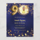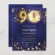 Um convite para fotos moderno e na moda para uma festa de aniversário 90. Um fundo azul marinho, decorado com estrelas ouros. A cor azul é irregular. Personalize e adicione sua foto e detalhes da festa. 1 folha = 1 convite impresso de borda a borda.
