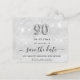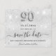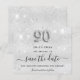 Um elegante cartão Save the Date para uma festa de aniversário 90. Um fundo metálico moderno, falso e prateado, decorado com poeira falsa. Personalize e adicione uma data e nome/idade. O texto: Salvar a Data é gravado com um script de estilo com letra de tendência grande. Número 90 com uma fonte no estilo do balão.