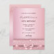 Um convite moderno, na moda e glamouroso para a festa de aniversário de uma mulher. Um fundo metálico rosa dourado falso com um arco de ouro rosa elegante, fita e brilho. O nome é escrito com um moderno e escuro, rosa dourado, escrito com letra de estilo manuscrito. Modelos para os detalhes da sua festa. Dica: Se você não quiser que pareça um cartão postal, clique em personalizar, vá para o verso e remova o divisor e o carimbo de posto.