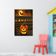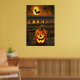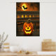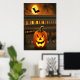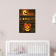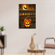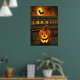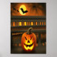 Uma abóbora feliz sorrindo parada em uma ponte, um céu amarelo escuro no fundo com uma lua amarela e um morcego voando em frente à lua. Esta é uma peça de arte gerada por IA