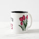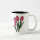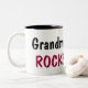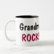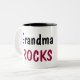 A caneca alegre diz rochas da avó e tem tulipas cor-de-rosa.