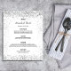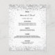 Um cartão de cardápio de casamento elegante e glamouroso. Personalize e adicione seus nomes, data e menu de casamento. Um fundo branco chic, decorado com faíscas cintilantes prateadas.