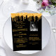Personalize e adicione seu nome, data, evento e menu. Fundo preto, decorado com pingos de ouro falsos. Voltar: adicionar uma foto, fatos BIO/Divertidos