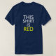 Este design é engraçado em um sentido irónico assim como uma maneira desconcertante. O texto indicado na camisa diz que esta camisa é vermelha. A palavra "VERMELHO" é colorida na tinta amarela e a camisa é de facto azul. O design é baseado nos testes do stroop e nos efeitos do stroop resultando de mostrar cores de texto em cores diferentes. O visor é dito então para dizer a cor da palavra e para não ler a palavra. Cronometra frequentemente a mente é enganado na leitura como como apposed ao pensamento da cor que a palavra estêve imprimida. A ideia inteira é que o teste é uma provocação de cérebro, confundindo o visor na submissão. A cor do texto neste design é branca quando a palavra "VERMELHO" for amarela.