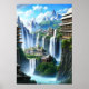 Uma bela cidade perto de uma maravilhosa queda d'água com uma montanha ao fundo. Esta é uma arte gerada por IA.