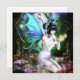 Uma bela cena de fantasia com uma fada, sentada à beira de uma piscina de rocha no fundo da floresta à noite, com um vagalume em suas mãos. Ela tem asas azuis, cabelo escuro e está cercada por lanternas e magia.
