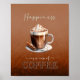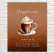 Uma xícara de café enfeitada com chantilly, xarope de chocolate garoa, e uma canela. A xícara se senta sobre um pires, com grãos de café espalhados ao seu redor. O fundo é uma cor marrom-quente com aspecto texturizado. O texto na poster diz "Felicidade é uma xícara de COFFEE", com "Felicidade" escrita em um estilo fluente e escrito à mão e "COFFEE" em uma fonte ousada e decorativa. No geral, a poster transmite a ideia de que encontrar alegria e contentamento pode ser tão simples quanto desfrutar de uma xícara confortável de café.