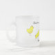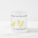 Quatro pintinhos amarelos na caneca que diz, "galinhas são como microplaquetas de batata… que você não pode ter apenas um!"