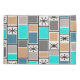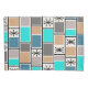 Um padrão moderno de abstrato-arte meio século com retângulos e starbursts sputnik em múltiplas cores de turquesa, ouro, bege / bronzeado e azul lacrimogênio.