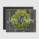 O design é composto por uma luva verde e lúcida de folhagem sobre um fundo de madeira escura, com um cartões de natal escrito em uma tipografia musical cursiva. Disponível aqui: http://www.zazzle.com/store/selectpartysupplies