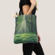 A luz do sol filtra-se através de árvores altas e densas, lançando um brilho radiante sobre um chão de floresta verde e luxuoso, pontilhado de delicadas flores brancas. O ambiente sereno evoca um sentido de paz e tranquilidade.