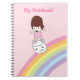 A menina bonito surfa o arco-íris no caderno do