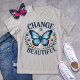 Celebre o crescimento e a transformação com esta inspiradora "Mudança é Bela" borboleta tee. Apresentando uma borboleta azul e roxa flagrante cercada por delicados florais e nuvens de aquarelas, é um lembrete ousado de que até as transições da vida podem ser cheio de cor e graça. Um presente pensativo para qualquer um que abraça um novo capítulo.
