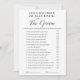 Apresentando o cartão de jogo do Chá de panela "A noiva realmente conhece o noivo" da CaMiDesigns. Este cartão de jogo preto e branco minimalista adiciona um toque de elegância às suas festividades de chá de panela enquanto proporciona uma maneira divertida de testar o conhecimento da noiva do seu noivo. Perfeito para criar momentos memoráveis e risos entre os convidados, este jogo é uma adição deliciosa a qualquer celebração. Para obter assistência com pedidos, envio, informações sobre produtos e muito mais, entre em contato diretamente com o Atendimento ao Cliente da Zazzle.