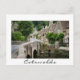 Cartão-postal da ponte sobre o rio Bybrook, na pequena e delicada aldeia do Castelo Combe, com casas construídas a partir de pedra de cor de mel nas Cotswolds, Inglaterra, Reino Unido, com uma fronteira branca e o texto: "Algodão".