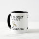A vida for grande quando você possuir um cão de Schutzhund! Uma figura bonito pessoa da vara dos desenhos animados tem um cão marrom travado firme em uma luva da mordida. Caneca de café muito bonito do schutzhund, em uma variedade de presentes.