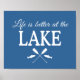Esta poster adorável será a adição perfeita ao seu lago ou à sua decoração doméstica. Esta placa apresenta um texto branco "A vida é melhor no LAKE" com peixes brancos e remos de barco, sobre fundo azul profundo.