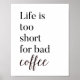 Este humorístico poster de café impresso é perfeito para felicitar sua casa/cozinha ou decoração de escritório. Esta design apresenta a frase, A vida é muito curta para café ruim, em uma simples fonte preta com um destaque de escrita marrom-escuro.