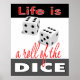Design preta, cinza e vermelha com um par de dados com as palavras "a vida é um rolo de dados" nela escritas. Trabalho de arte moderno para um cassino, caverna do homem, sala de jogos, salão ou bar.