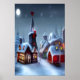 A vila de Natal no inverno à noite com neve no chão e casas e a lua no céu. Esta é uma arte gerada por IA.