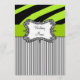 A zebra preta e verde listra cartões Wedding impressos do menu com acentos verdes e teste padrão listrado do preto, o cinzento e o branco. Um cartão verde, preto e branco corajoso do menu do casamento do divertimento para as mesas da recepção com os nomes dos noivos e o menu do casamento na parte de trás do cartão. Design pelos gráficos do © de Elke Clarke licenciados.