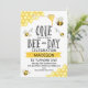 Bee Themed Bee Primeiro Aniversário Convite Cuta abelha foi temido primeiro convite de aniversário com quatro abelhas bonitinhas, alguns favos de mel e mel pingando. Este design de convite temático para abelhas é uma maneira fofa de convidar convidados para uma primeira festa de aniversário de abelhas.
