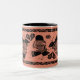 Desenhos de tinta das plantas e das antigas abelhas geométricas na caneca vermelha quente. Inspirado pelo estilo da cerâmica antiga. Arte rock.