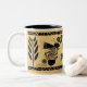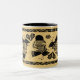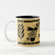 Desenhos em tinta de plantas e abelhas geométricas antigas na caneca creme. Inspirado pelo estilo da cerâmica antiga. Arte rock.