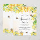 Um convite de festas de verão com fundo branco e ouro aquoso. Decorados com espécimes do gênero Bombus, melando mel e favos de mel com flores amarelas, flores e um pote de mel. Personalize e adicione um nome e detalhes da parte. Ouro e letras pretas. Perfeito para uma festa de verão ou outono