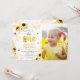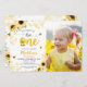 O convite para o primeiro aniversario de girassol apresenta belas abelhas e flores e colmeia de abelhas. Esta design é ideal para alguém que tenha uma festa de aniversário temática de Abelhas de Girassol.