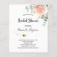 Um convite para uma noiva. Um fundo branco chic. Decorado com ouro rosa, flor floral cor-de-rosa-penteada (rosa), verde-eucalipto, folhas e pererecas, cor-de-rosa, e um belo e feliz abelhão. Personalize e adicione um nome e detalhes da parte. Letras negras. O texto: Chá de panela e o nome da noiva a ser é escrito com um moderno estilo escrito à mão. Traseira: cor de fundo Rosa dourada e abelha feliz sorrindo.