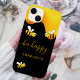 Um fundo preto chic decorado com mel gotejante de ouro. O texto: Bee Happy com um script de estilo com letra de ouro com balsas. Personalize e adicione seu nome.