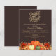 Um fundo castanho escuro. Decorado com abóboras e flores laranja e amarelas. Personalize e adicione os detalhes da festa. Script de texto: Grateful e abençoado. 1 folha = 1 convite impresso de borda a borda.
