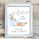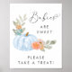 Um favor bonito e um sinal de boas maneiras para o seu chá de bebê que apresenta "Bebês são doces, por favor, façam um tratamento" numa mistura de uma escrita elegante com um inchaço cardíaco e uma simples tipografia de cinza, e uma aquarela de uma abóbora azul pastel, flores e verde.