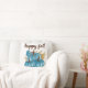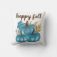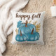 Almofada de abóboras de outono! A citação da tipografia moderna diz "feliz outono". Apresenta três abóboras azuis coloridas da moda com folhas de outono. Fundo branco macio. Muito aconchegante!