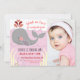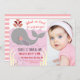 Festa de aniversário temática de baleia do mar náutico. Ajuste o texto para torná-lo seu. Mão desenhada, ilustração adorável de baleias. Tema azul claro e branco, fundo listrado constituem esse design de aniversário fofo. Primeiro Aniversário. Festa de moça. tema rosa claro. modelo cartão com fotos.