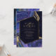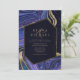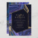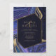 Você tem o glamour e o alto impacto com este conjunto de casamentos coordenadores que apresenta padrões abstrato agate, texturizados com falso-cristais e destaques em folha de ouro falso e brilhante. Combinações de cores impressionantes, como esta suite com sua paleta de céu noturno de azul noturno profundo a violeta mole, criam o fundo das peças desta coleção coordenada. Este elegante convite de casamento mostra tudo acima com um hexágono, semitransparente em azul escuro e marinho, para guardar o seu texto. É fornecido um modelo para adicionar facilmente os detalhes do evento. Veja o link de coleção nesta página para ver todos os itens correspondentes neste belo design ou ID827 de pesquisa para ver opções de cores adicionais para este design.