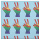 A pintura abstrato de uma mão nas cores do arco-íris, que dá um sinal de paz, está ligada ao tecido personalizado. A cor de fundo do azul-céu pode ser personalizada.