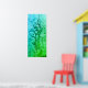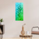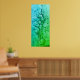Este trabalho de arte é um abstrato vertical com um gradiente de blues e verdes. As cores fazem uma transição suave de um azul brilhante e profundo no topo para um verde vibrante no fundo. Uma linha branca distinta corre hetero no centro da peça, acrescentando um sentido de profundidade e divisão. A textura superficial é rica, com formas circulares e orgânicas espalhadas pelo ambiente, dando sentido de fluidez e movimento. O efeito global é sereno e evoca cenas subaquáticas ou texturas naturais.