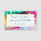 Um casamento salva a cartão de visita magnética da data. Projetado com um design abstrato artístico rico. Pintura aquosa com as cores misturando e misturando criando um padrão ondulado fluente. Um quadro branco com uma borda falsa de folha de ouro colocada sobre cima com seu dentro de texto personalizado.